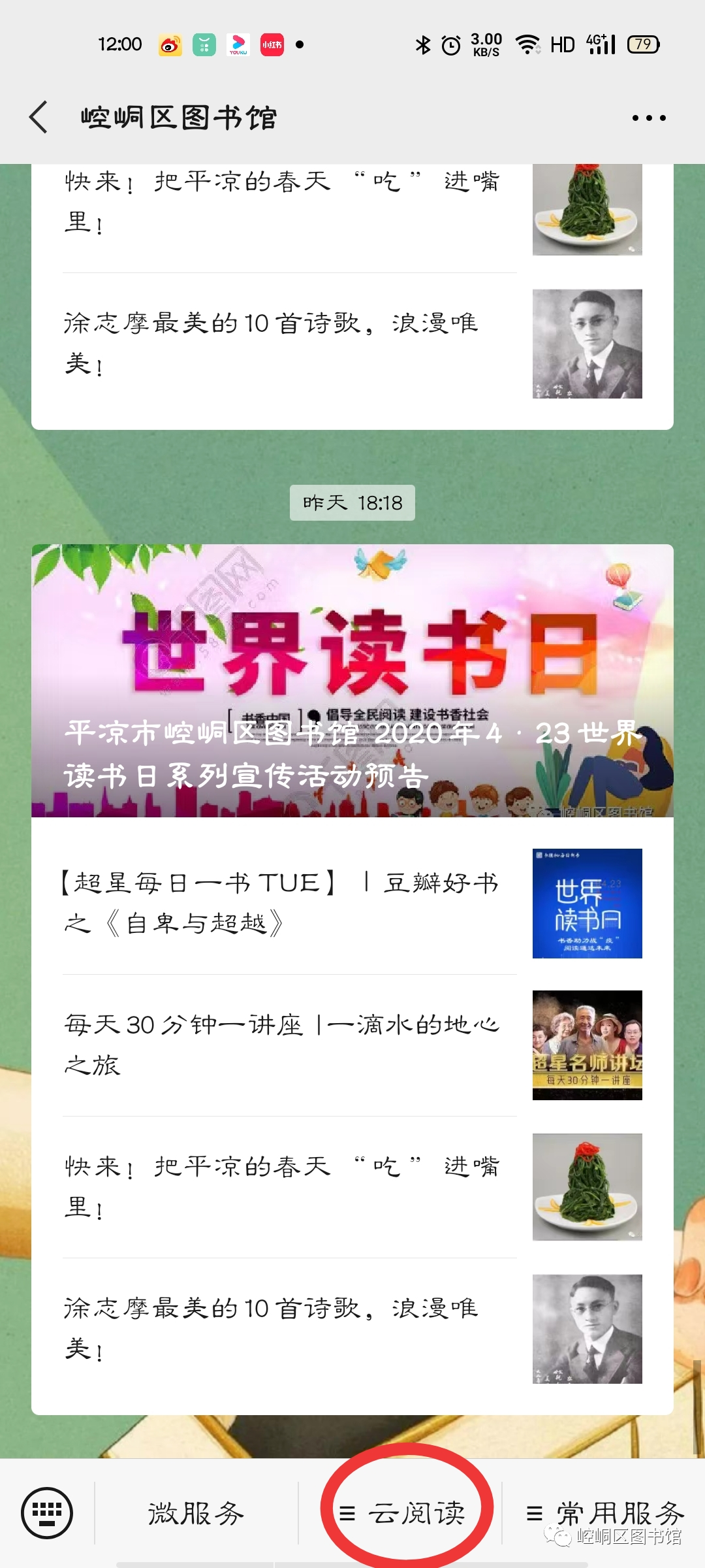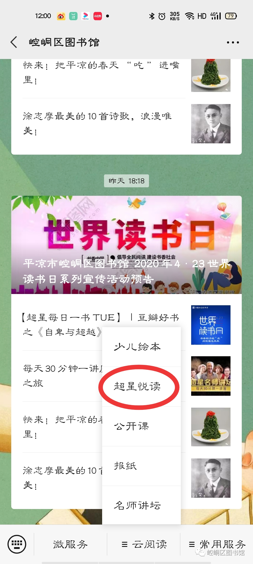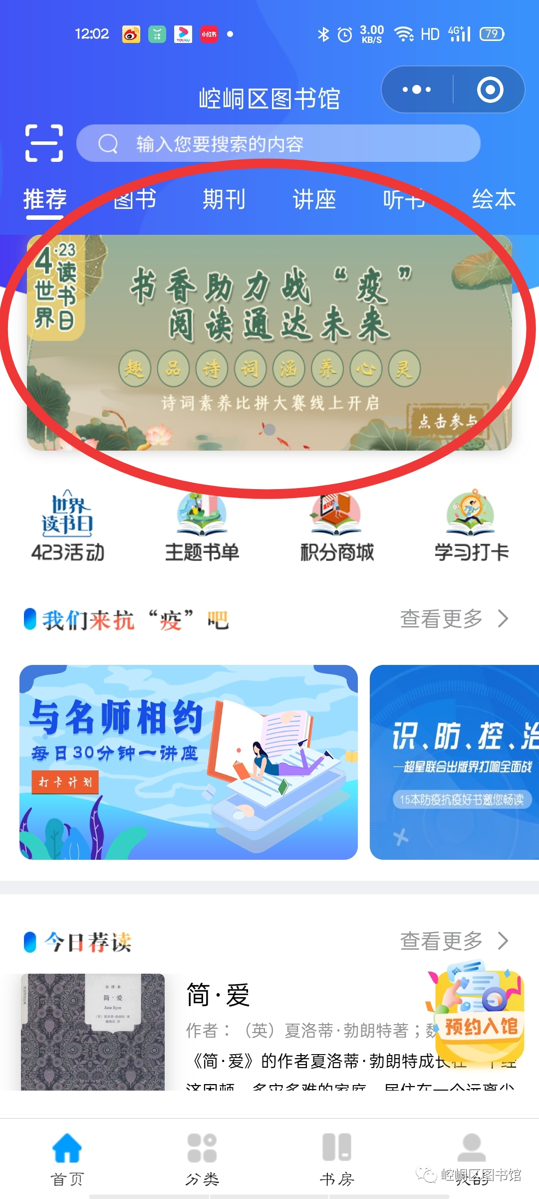 趣品诗词,涵养心灵——诗词知识竞答 活动主题 趣品诗词,涵养心灵——诗词知识竞答 主办单位 主办单位:崆峒区图书馆 协办单位:超星集团 活动时间 2020年4月23日—2020年5月12日 如何参与活动 步骤一:扫描二维码,关注崆峒区图书馆微信公众号 步骤二:点击“云阅读”菜单栏 步骤三:点击进入“超星悦读”小程序 步骤四:点击答题战“疫”知识挑战活动,点击“登录”授权手机号。